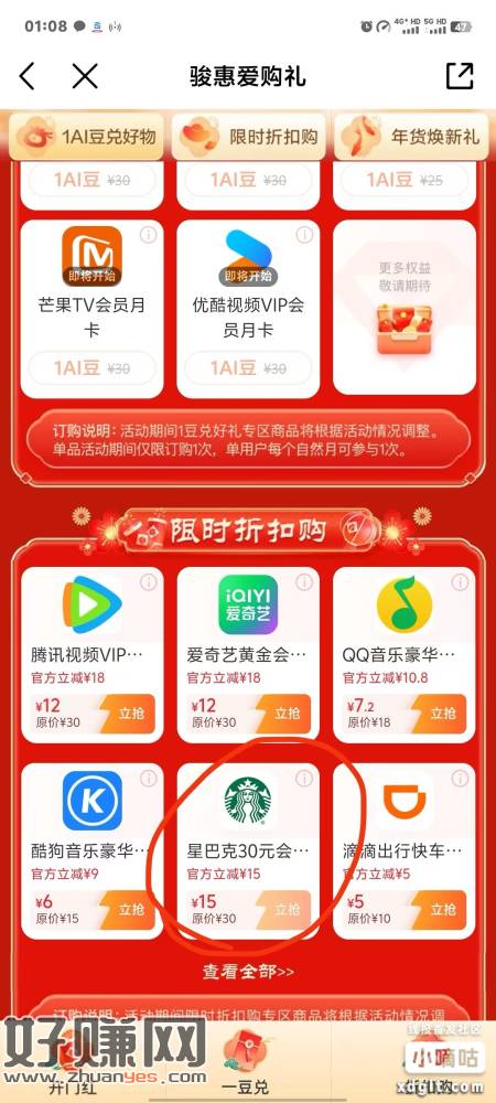移动app 5折星巴克30 润10 拉满