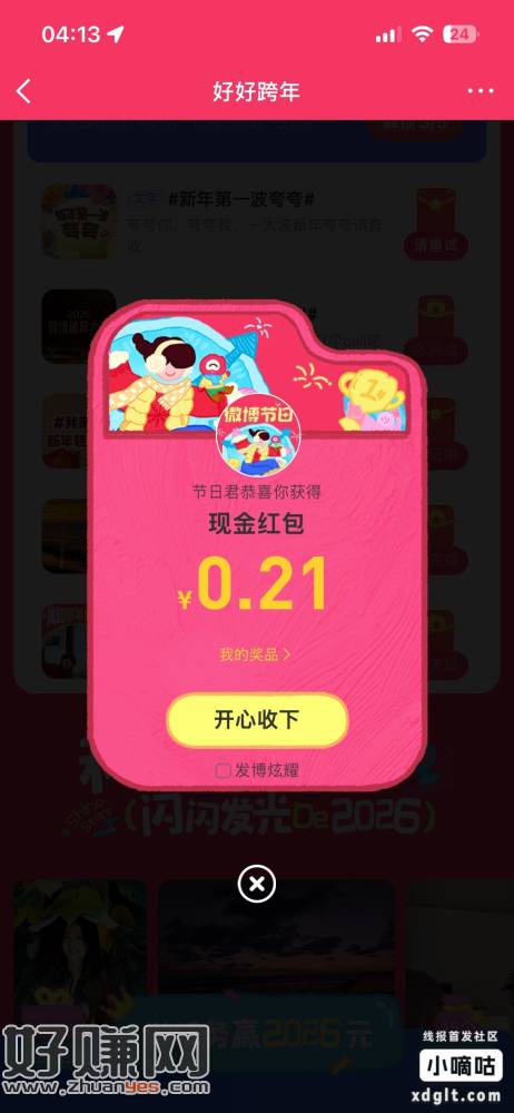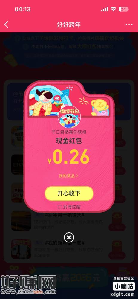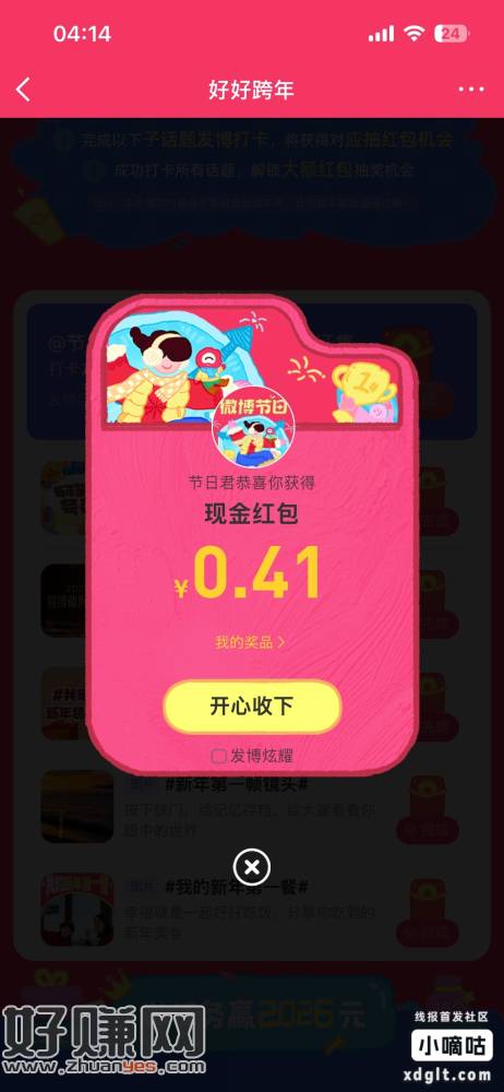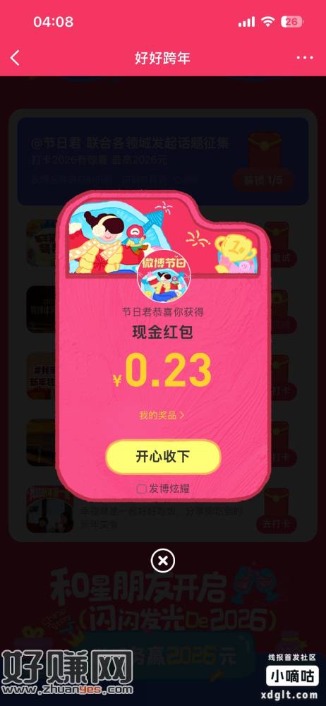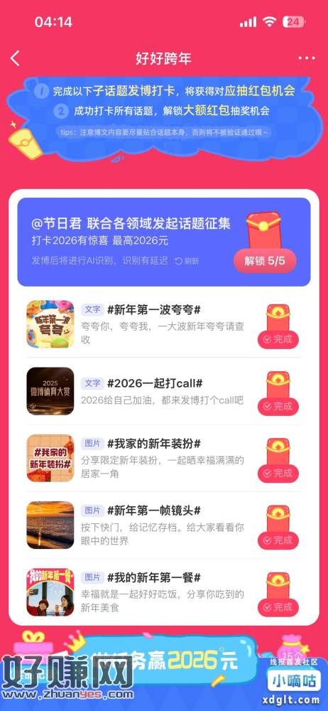 微博 APP 你好 2026刚中 2.09 元当前活动页面一共两个活动1. 集福袋(都是小毛)2.下滑有 5 个话题发表(基本都是 2 毛以上)