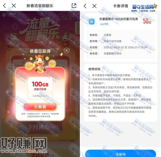 亲测中20GB流量月包,有反馈中100GB、50GB流量月包,移动的去领取一下试试