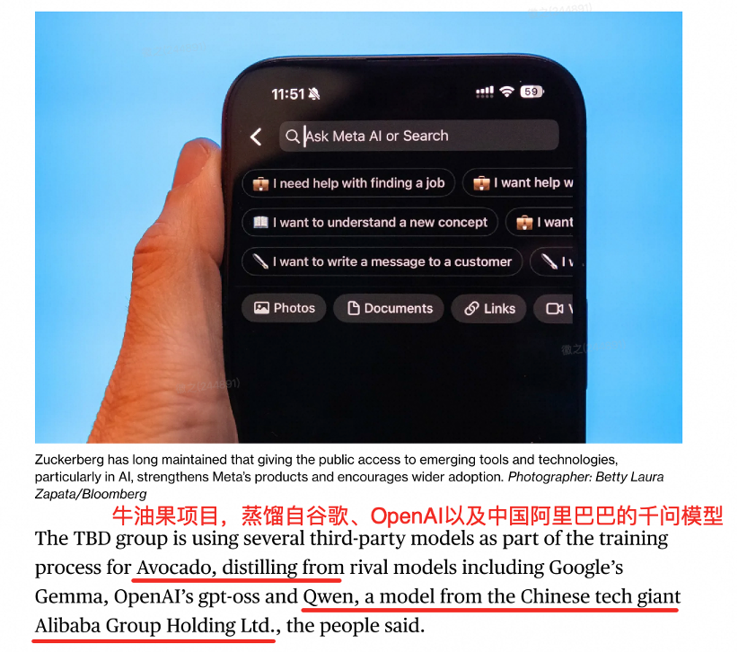 根据彭博社报道,扎克伯格密切关注的TBD实验室团队,在“牛油果”模型的训练中,蒸馏了包括谷歌Gemma、OpenAI的gpt-oss以及阿里巴巴Qwen在内的多方开源模型。