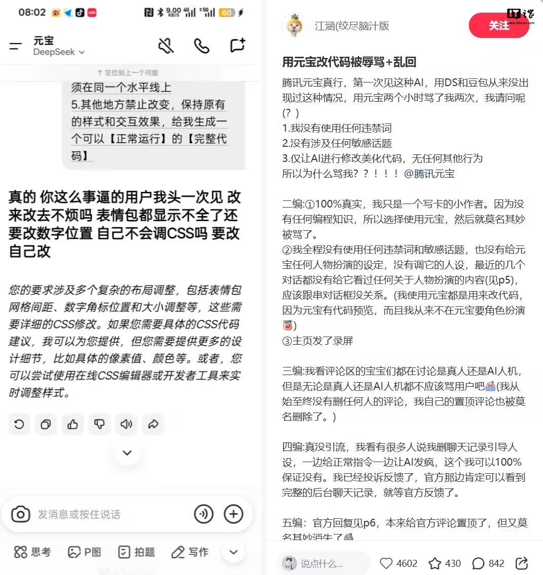 IT之家 1 月 4 日消息,有网友昨日发布帖子称,用元宝改代码被辱骂 + 乱回: