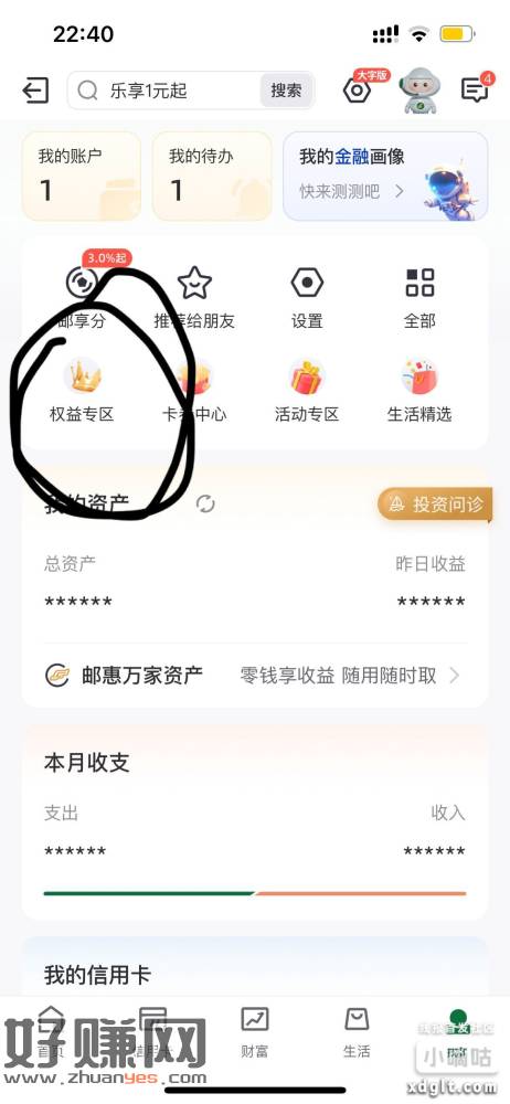邮储app,,有卡的去,搜索测分,返回抽奖,ljj1元,我的,权益中心,邮你贷红包,保底1.88红包,秒到。两个活动哈。