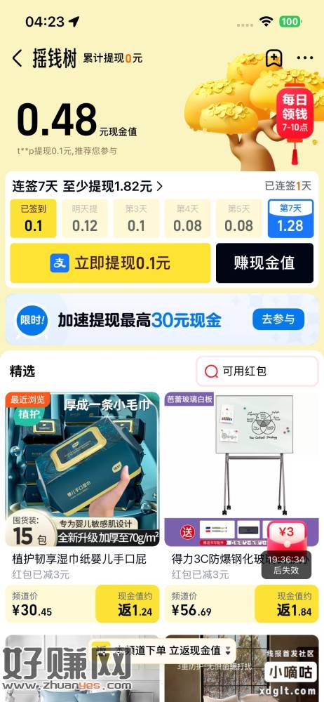 天猫首页右上角进去点加速提现,撸实物第一个立返,第二个分7天返