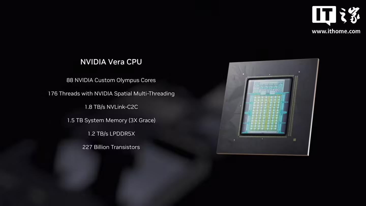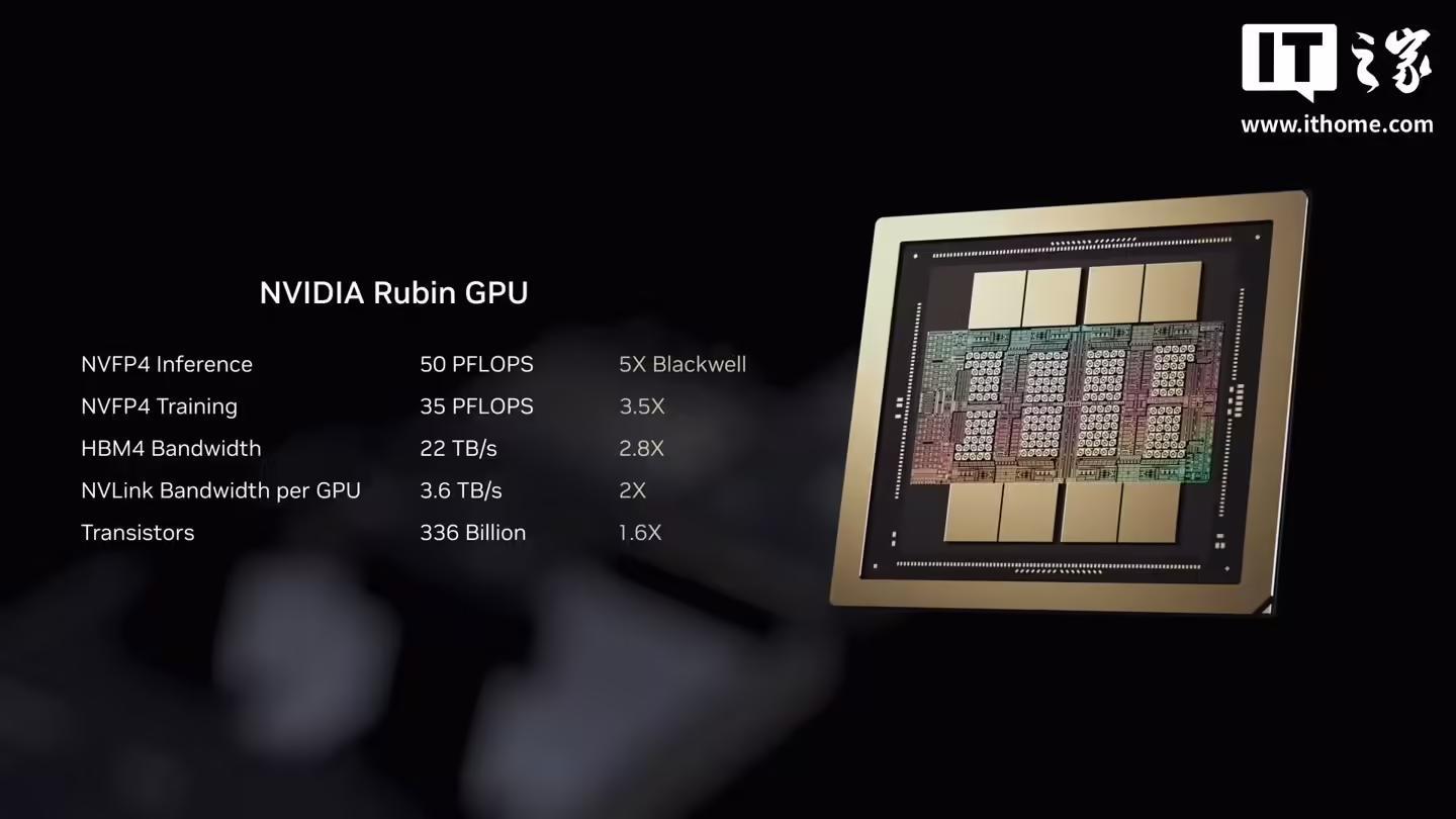 在性能表现方面,IT之家援引博文介绍,Rubin 架构相较于前代产品实现了显著跨越。根据英伟达官方测试数据,Rubin 在 AI 模型训练任务上的运行速度是 Blackwell 架构的 3.5 倍;在推理任务中,其速度更是达到了前代的 5 倍,峰值运算能力高达 50 Petaflops。
