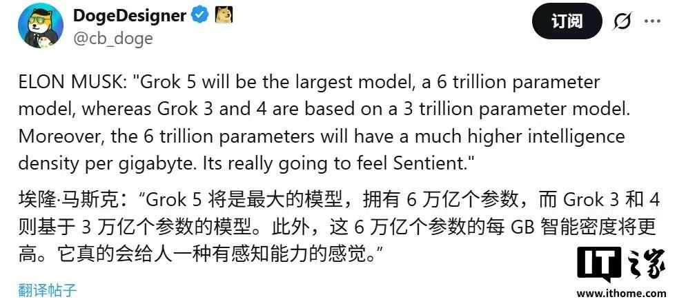 该媒体指出 xAI 推迟发布 Grok 5,部分原因在于开发过程中遇到的资源限制和极其严格的测试需求。作为迈向通用人工智能(AGI)的关键一步,Grok 5 预计拥有约 6 万亿参数,其训练和优化需要巨大的计算能力。