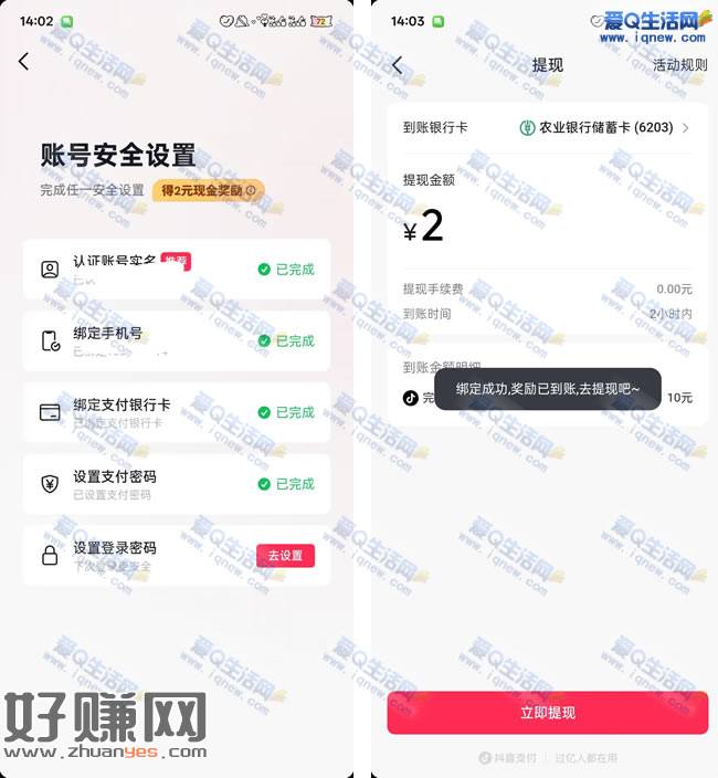 抖音APP-顶部左侧【头像】更多【安全中心】-【账号安全】-【安全设置】-完成任意安全设置-2元-去设置即可获得2元提现秒到