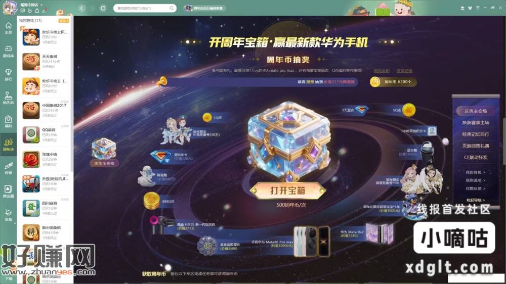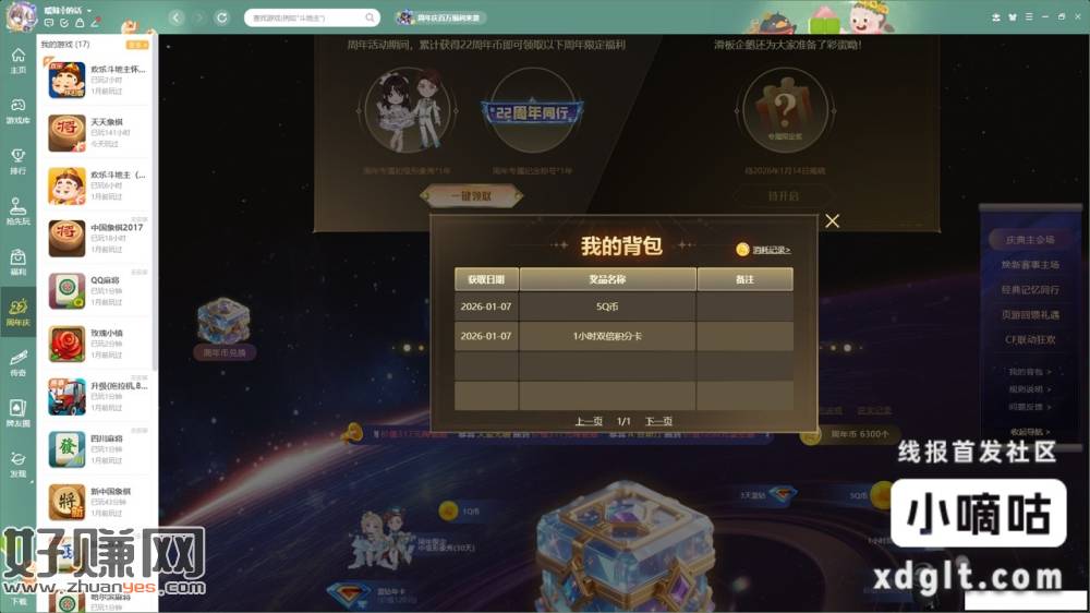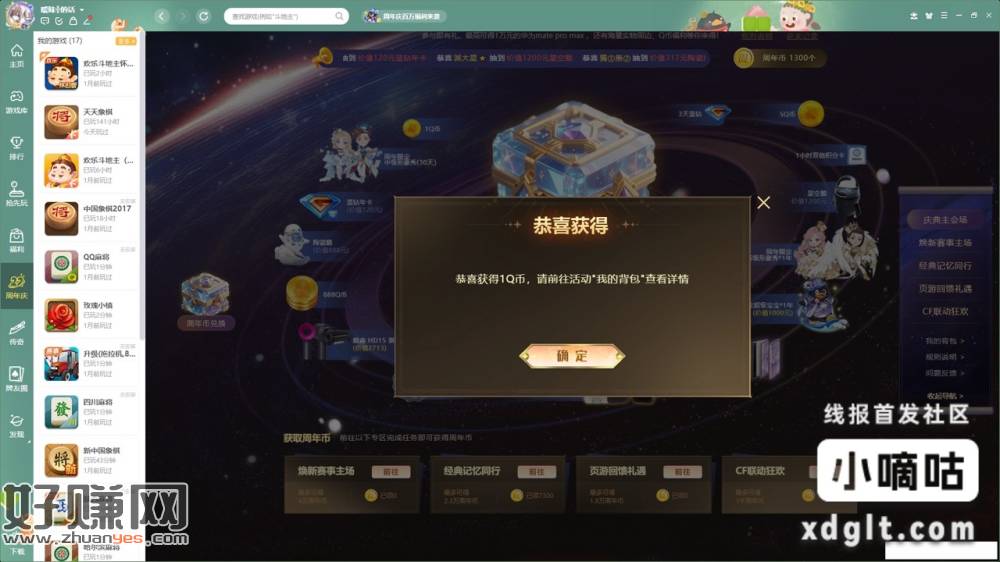 有电脑的有福了 QQ 游戏大厅两发就中 5Q 币“经典记忆同行”里面可以领几千周年币赶紧拿你爷爷在家天天玩 QQ 游戏的号去领有耐心的也可以攒周年币 3 万周年币兑 100Q 币每周补货