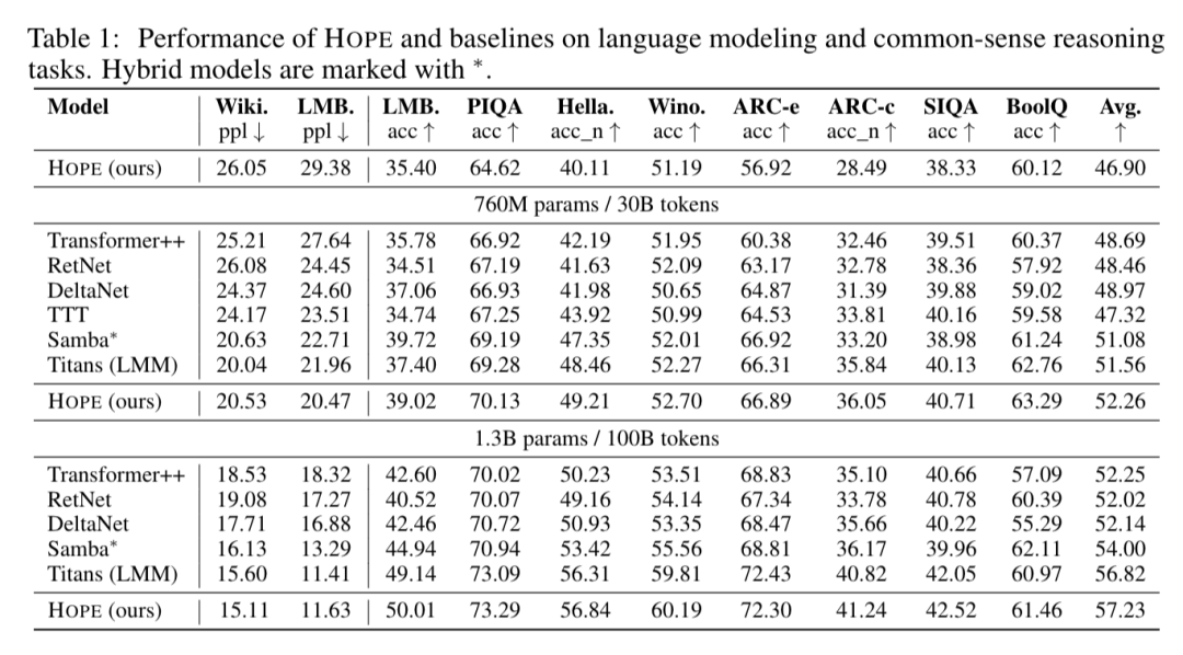 经过测试,在语言建模与常识推理任务中,从760M到1.3B参数规模的Hope,表现均大幅超越Transformer、RetNet、DeltaNet等主流基线模型。