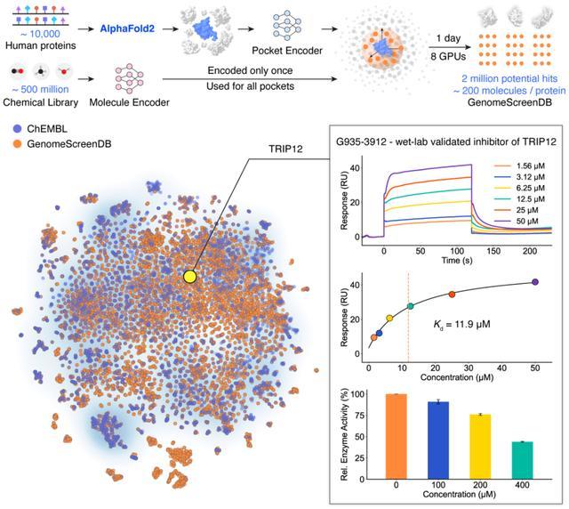 依托该平台,团队首次完成了覆盖人类基因组规模的药物虚拟筛选,可覆盖约 1 万个蛋白靶点、2 万个蛋白口袋,分析筛选超过 5 亿个类药小分子,总共富集出超过 200 万个潜在活性分子,构建了目前已知最大规模的蛋白-配体筛选数据库,该数据库已免费面向全球科研社区开放。