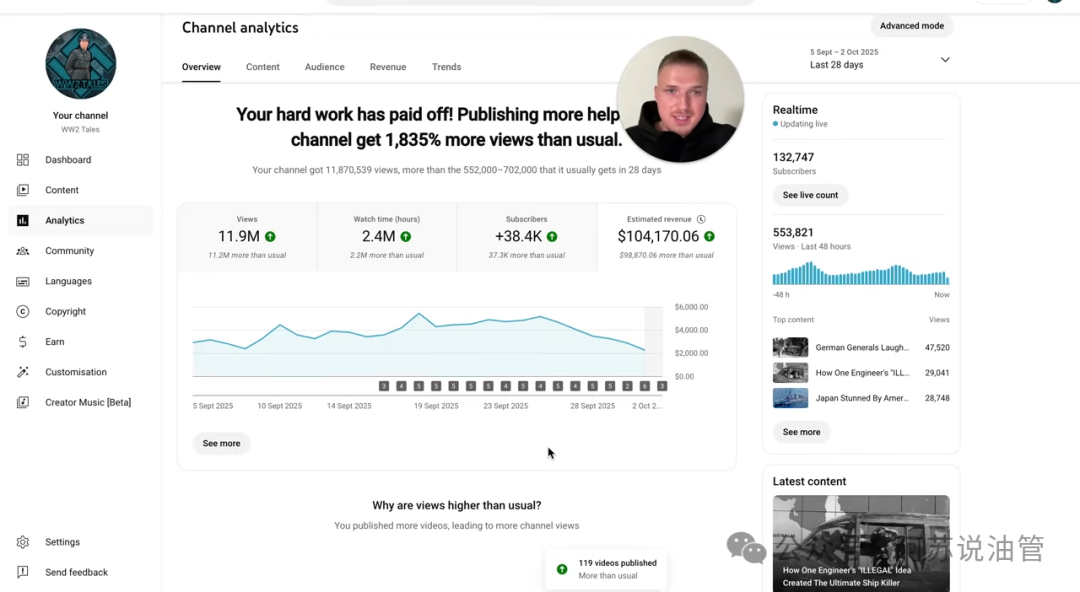 第一个案例来自WW2 Tales ,一位 AI课程讲师帮学生用 AI 复活了这个已经被放弃的频道。频道主讲二战战俘,主题冷门、画面简陋,却在复活后一个月就赚了11万美金。