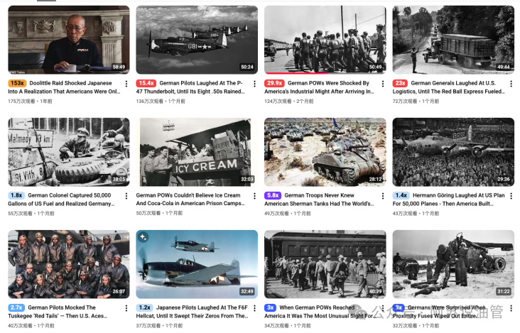 整个频道专注长视频,点击率并不高,但观看时长极长,直击二战经历的情感回忆,广告插入多,再加上频道本身是老账号,平台信用值高,很快就重新被算法激活。