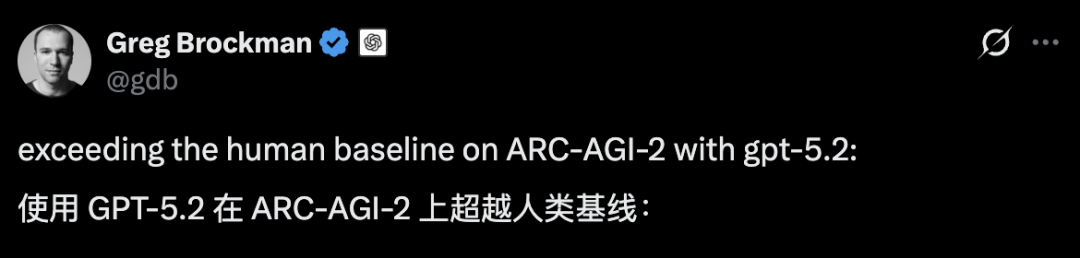 OpenAI联合创始人Greg Brockman发帖称使用GPT-5.2在ARC-AGI-2基准测试上,表现超过了人类基线水平。