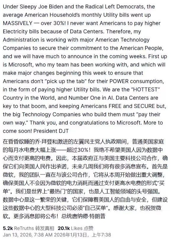 特朗普称,”首先是微软,我的团队一直与该公司合作,本周起,微软将推出重大调整举措,确保美国人不会因为微软的电力消耗而通过支付更高水电费的形式‘买单’。”