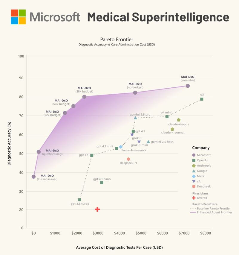 ■微软打造的MAI诊断协调器,最复杂病例的准确率高达85%,比经验丰富的医生高出四倍,且成本降低20%,并避免了许多不必要的检查