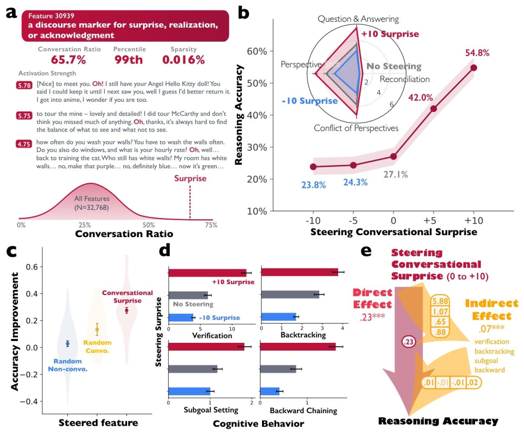 当团队通过激活添加法强化模型的对话特征,放大“哦!”这类表达惊讶、转折的话语标记时,模型在Countdown算术推理任务中的准确率直接从27.1%翻倍至54.8%。