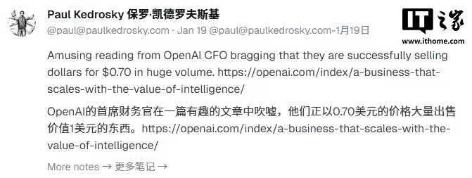 然而,这番表态并未平息外界的质疑声。科技博主保罗・凯德罗夫斯基在周一看到弗莱尔的博客后评论称:“OpenAI 首席财务官在博客里吹嘘自己正以巨额规模做着‘拿 1 美元的东西卖 70 美分’的生意。”