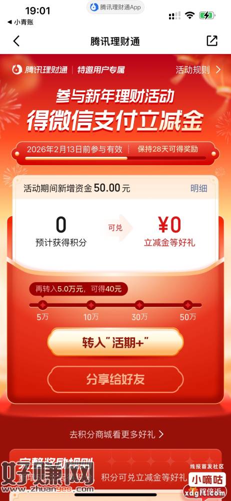 微信理财通新年福利存5w活期领40毛,钱多的上