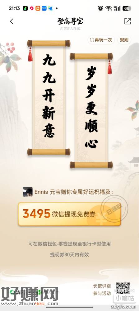 微信支付有优惠-重阳登高寻宝活动-玩小游戏得微信提现免费券,有效期一个月。