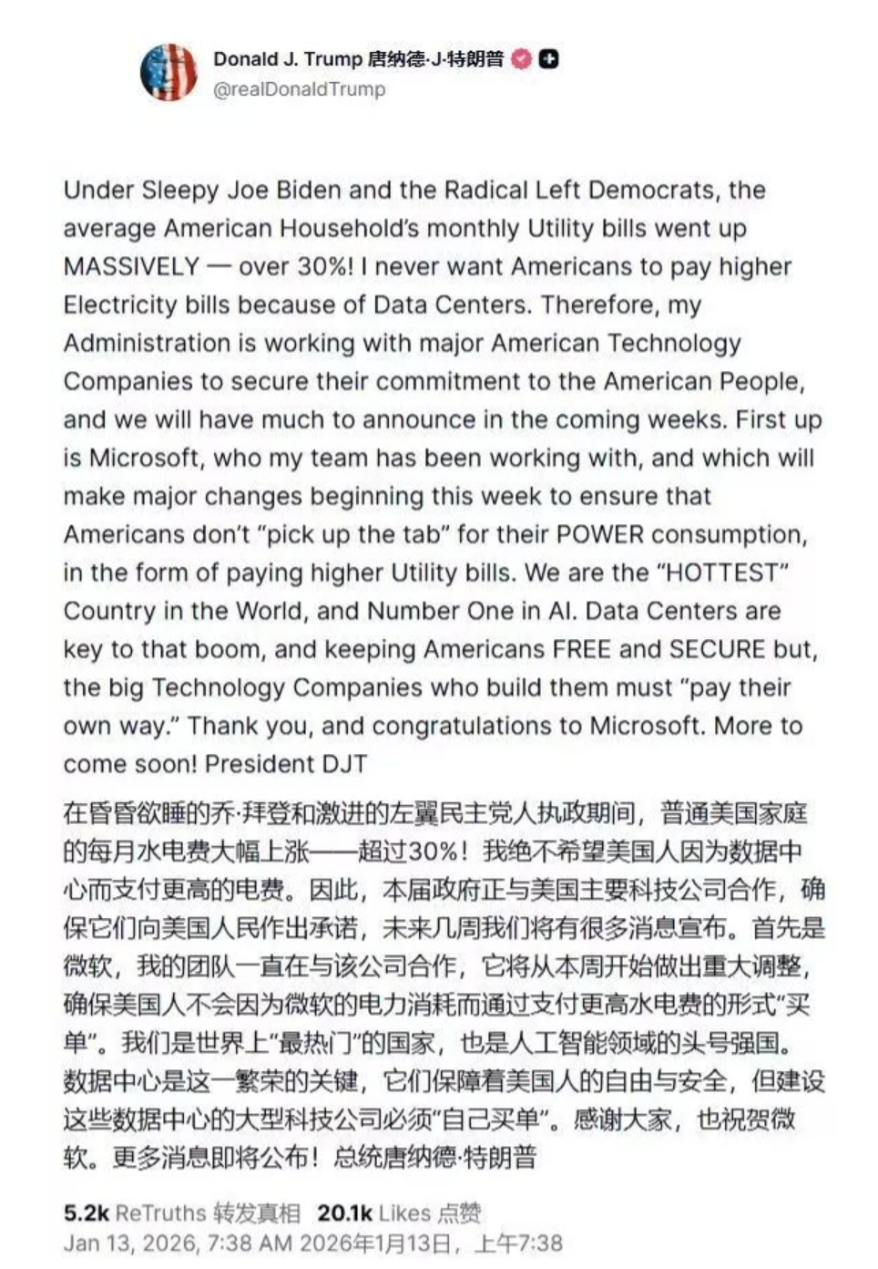特朗普称,”首先是微软,该公司将推出重大调整举措,确保美国人不会因为微软的电力消耗而通过支付更高水电费的形式‘买单’。”特朗普还强调,建设这些数据中心的大型科技公司必须“自己买单”。