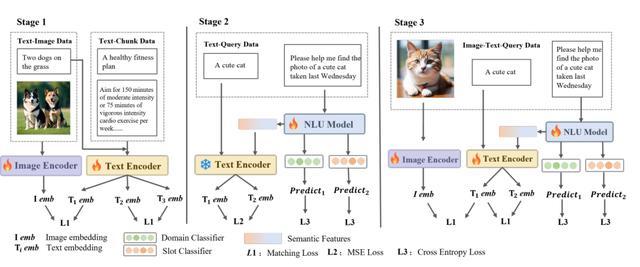 本研究提出了一种统的一多任务学习框架,将“找图、找文、意图理解”这三个任务整合到两个模型,一个架构中,在该框架下,文本编码器同时对齐图像和文本的语义空间,并通过跨注意力机制与 NLU 模型进行语义交互。
