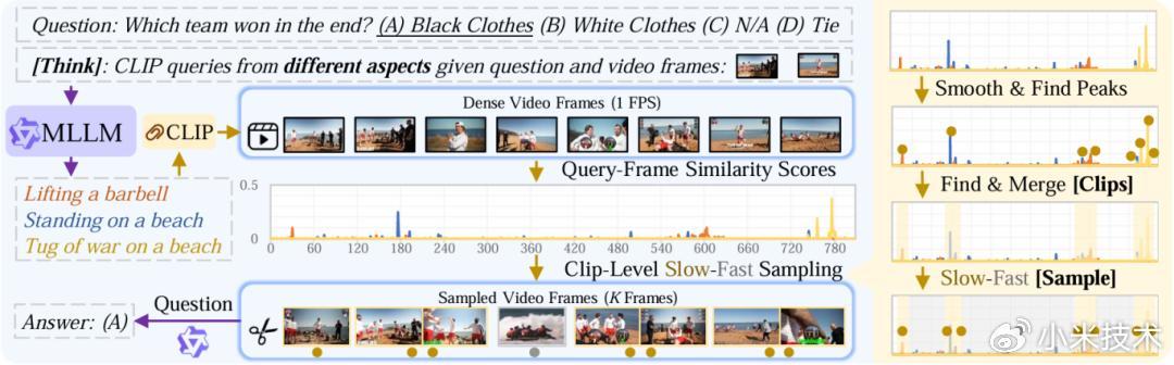 为此,小米大模型团队与中国人民大学高瓴人工智能学院联合提出了一种无需训练的帧选择框架 Think-Clip-Sample(TCS),通过多查询推理(Multi-Query Reasoning)和片段级慢快采样(Clip-level Slow-Fast Sampling)两大核心机制,显著提升了 MLLMs 在长视频问答任务中的准确性与效率。