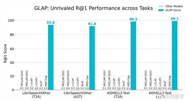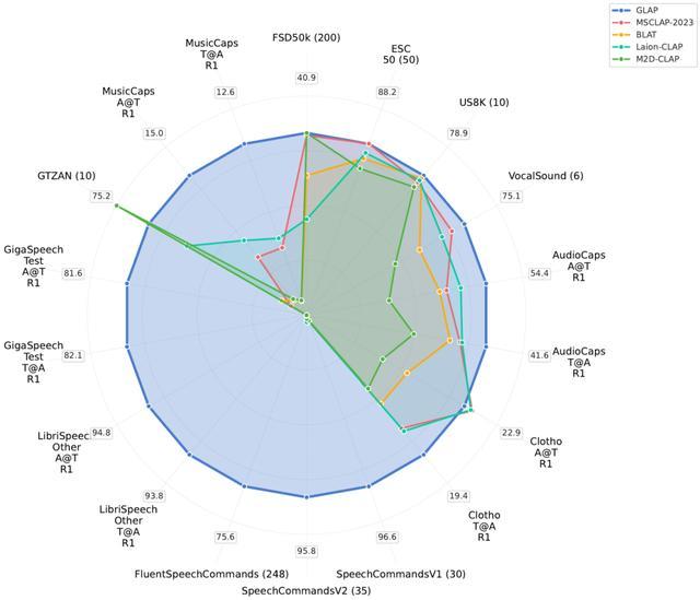 GLAP 实现了跨音频领域(语音 / 音乐 / 环境音)与跨语言的音频-文本对齐,能支持 RAG 形式的音频搜索。它首次通过单一框架同时优化语音、音乐及声音事件的检索与分类性能,解决了传统 CLAP 模型领域割裂的问题。在 LibriSpeech(英文)和 AISHELL-2(中文)语音检索上达到约 94% 与 99% 的 recall@1,同时在 AudioCaps 等声音检索基准保持 SOTA 竞争力。