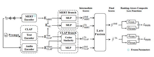 CLAP 强化音频与文本的语义对齐能力,捕捉“文意匹配”;MERT 则基于大规模音乐数据自监督训练,有效建模旋律、节奏、和声等内在音乐结构特征;采用晚期融合策略,保留各模态独立表征能力,通过专用映射网络在得分层进行融合,避免早期特征干扰,充分挖掘双路径的互补性;同时,引入排名感知复合损失函数,结合截断回归损失与对比排序损失,不仅提升预测精度,更显著增强模型对人类偏好相对顺序的理解能力,有效缓解传统回归损失对绝对评分偏差的敏感性。