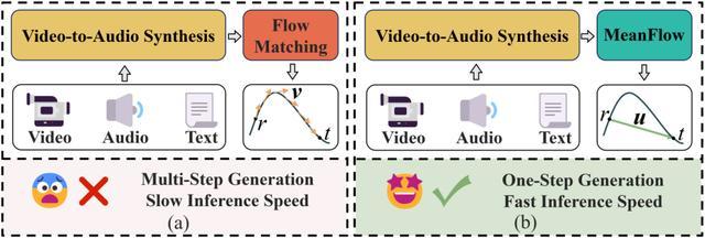 MeanFlow 首次在 V2A 任务中通过平均速度场建模替代传统流匹配(Flow Matching)模型的瞬时速度建模,从根本上解决了多步迭代采样导致的推理速度瓶颈,实现推理阶段的一步生成(one-step generation)。