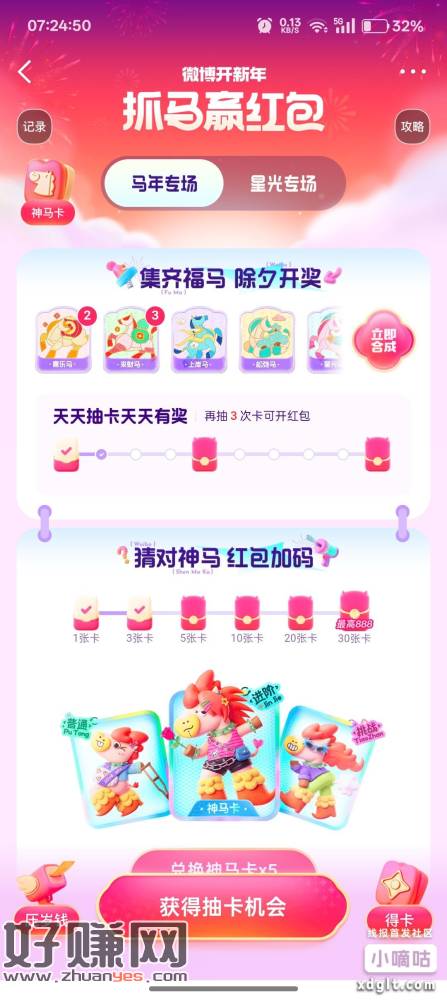 微博集卡(搜抓马赢红包)差不多两天搞定了,松弛马难一点,下面的这是神马兑换次数不急回答,关闭微博有答案,可以回头填写