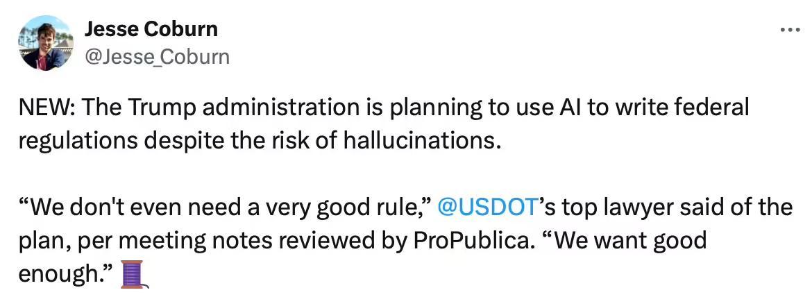 根据 ProPublic 获得的内部会议记录及员工访谈,该计划于上月向部门员工透露。DOT 最高法律顾问格雷戈里 · 泽尔赞表示,特朗普总统对此“非常兴奋”,并称该部门将成为“首个全面启用 AI 起草法规的机构”。他同时透露,该计划的最终目标是将法规起草与审核时间大幅压缩,AI 可在 20 分钟内生成草案初稿。