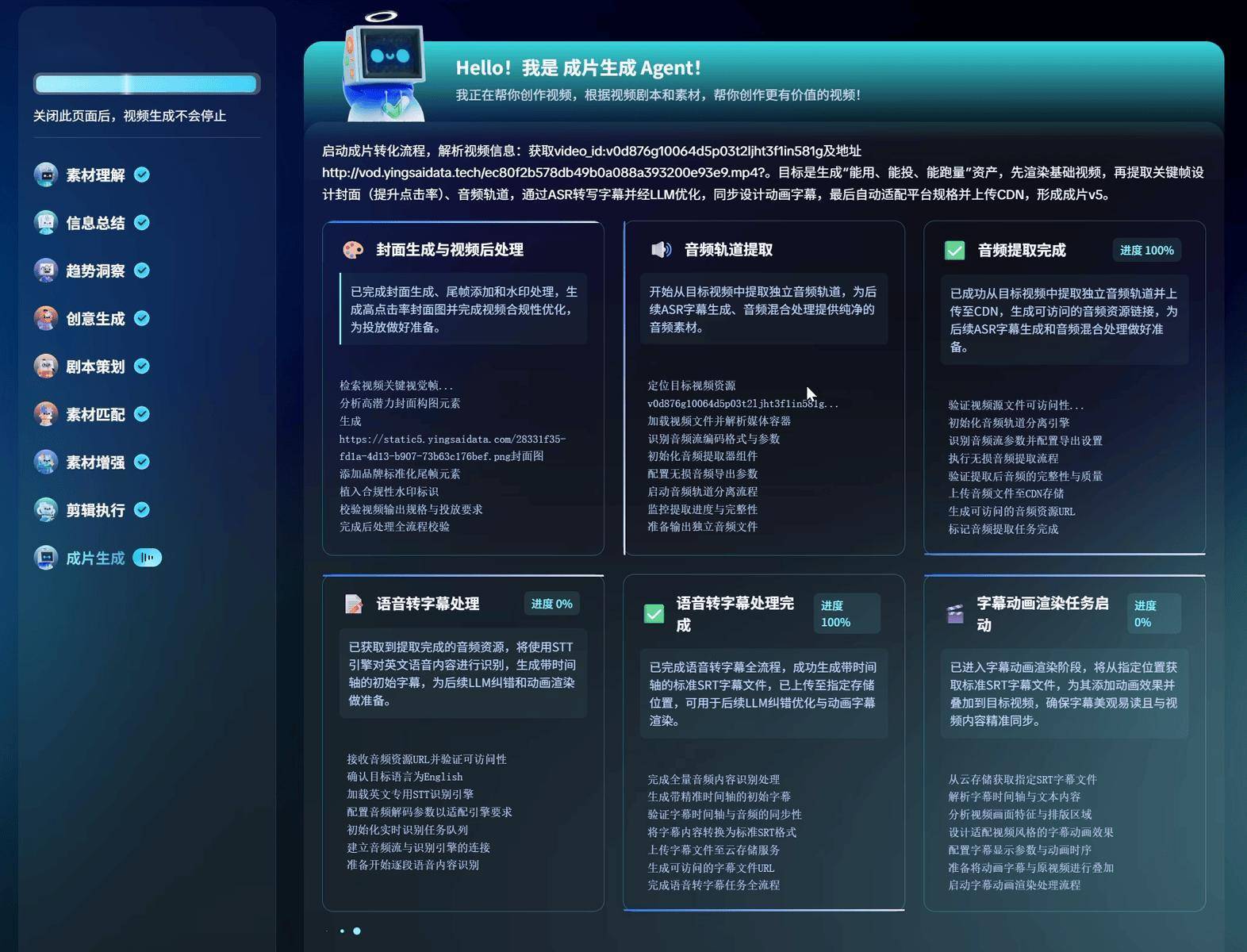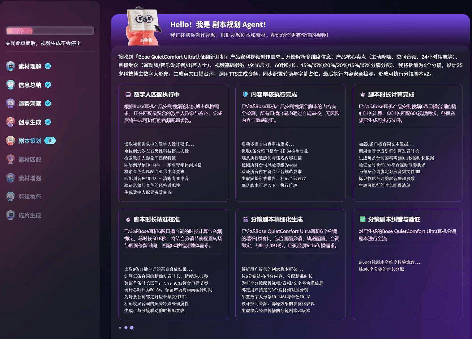 具体来看,我们只需要一条链接或上传商品图就能一键生成营销视频,从脚本生成、镜头匹配、剪辑渲染到多平台适配,整个流程清晰可见,并且还可控。甚至每个Agent负责哪些内容都有直观呈现,就如同今天大模型领域的“深度思考”过程。