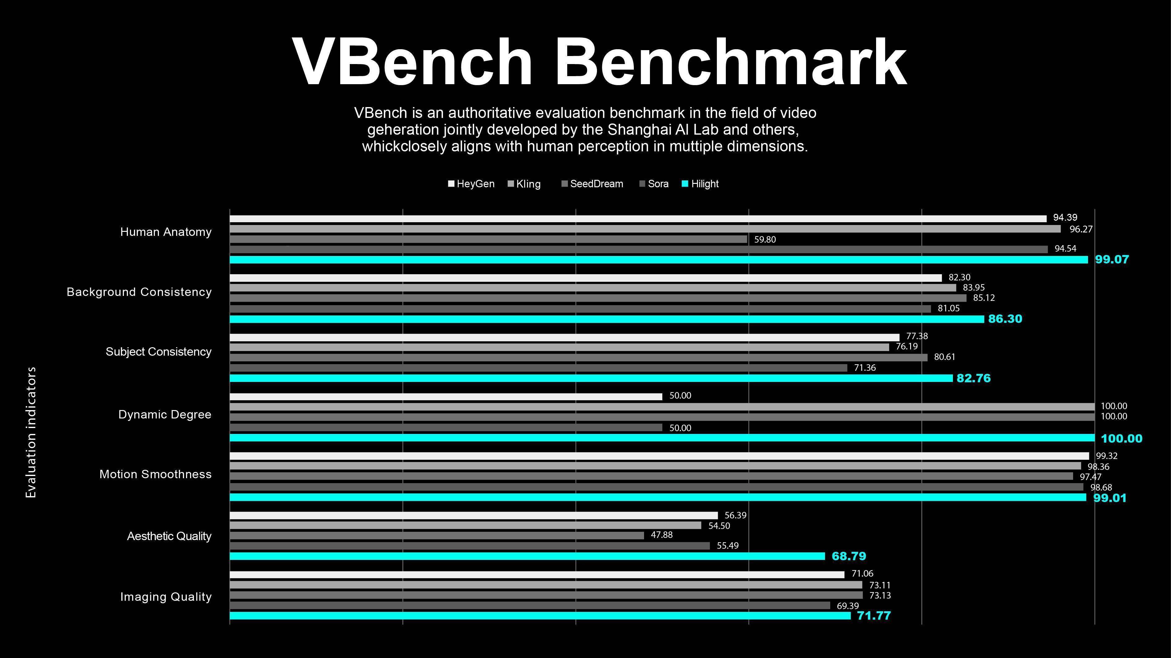 根据视频生成领域权威µµ基准测试VBench得分,Hilight在背景一致性、主体一致性两方面都在行业同类产品中位列第一,超越Sora 、Seed Dream等模型。