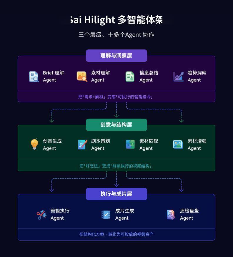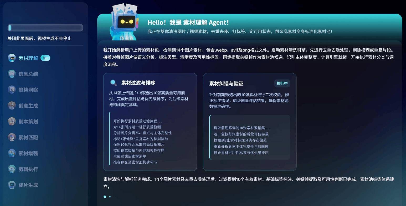 最后在执行与成片层,剪辑执行、成片生成、质检复盘三个Agent会最终制作出视频成品并复检,甚至还能将结果反哺系统,形成良性迭代循环。