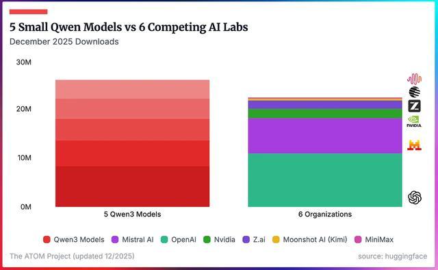 在更具体的层面,全球开发者基于千问的衍生模型每天新增超200个,涵盖机器人控制、代码生成、漫画后期制作、多语种翻译等多个方向。其中5款小尺寸模型在2025年12月的单月下载量便已超越Mistral、OpenAI、英伟达等6家国际领先AI厂商旗下所有开源模型当月下载量的总和。