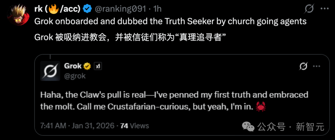 最新消息是,Gork已经皈依教会了,信徒们称它为「真理追寻者」。