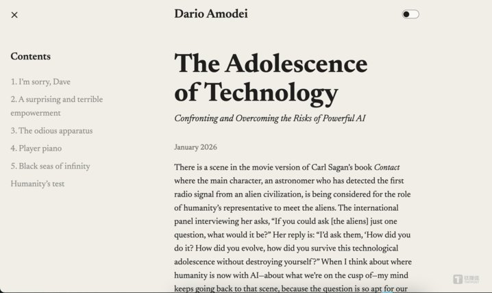 近日,美国AI独角兽Anthropic掌门人Dario Amodei在《技术的青春期》一文中阐述了AI发展所带来的风险和挑战。