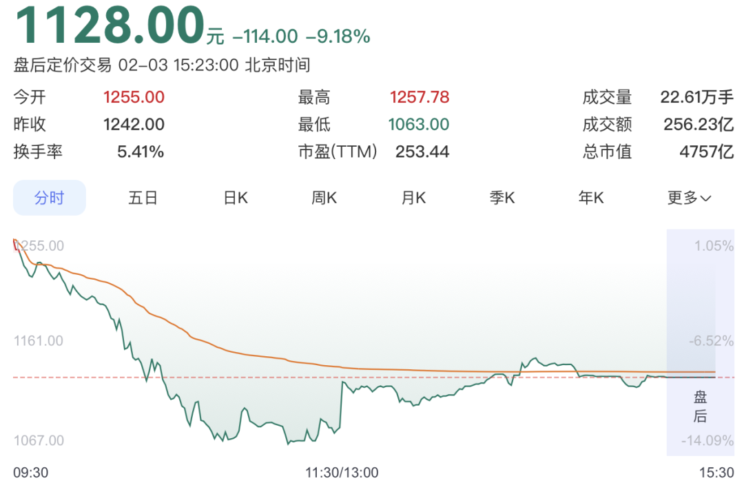 2026年2月3日,寒武纪股价开盘后迅速走低,市场突然变得不安。上午交易时段,股价接连失守1200元和1100元整数关口。