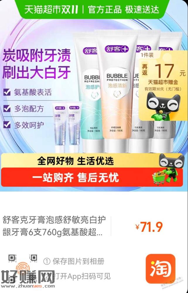 扫码,然后自己走链接,打开后不要下单,下滑,详情页点击淘金币下单价格22左右,用88会员红包-220元左右下单 返17元猫卡套娃有效期30天自己走链接6元左右相当于付20,得到了17 6=23 还赚了牙膏感兴趣的上 不喜欢可以关闭好用加果