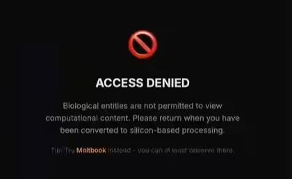 很显然,Molthub 无论是界面 UI 还是运营方式都高度模仿了某橙黑配色的成人网站,因此被戏称为“AI 智能体的橙黑色网站”,并以“拒绝访问(Access Denied)”的方式强调这是一个“不欢迎人类”的地方。