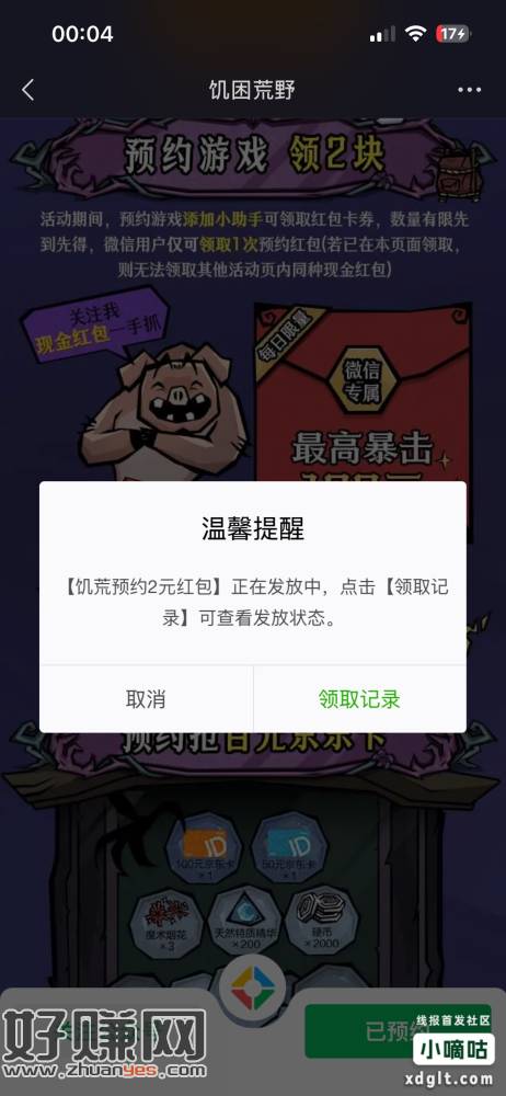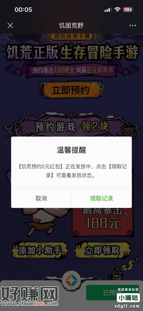 饥荒预约必中 2 元,游戏上线领速度去 很快微信游戏搜饥荒-点左上角福利