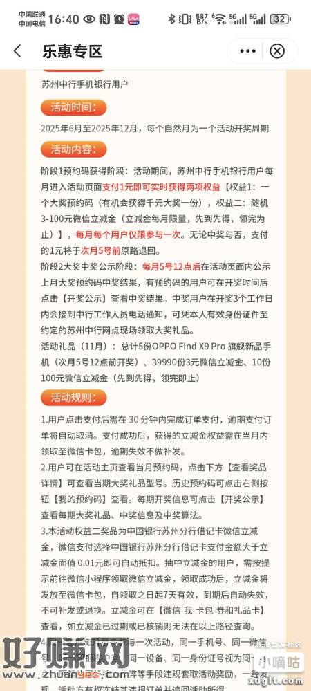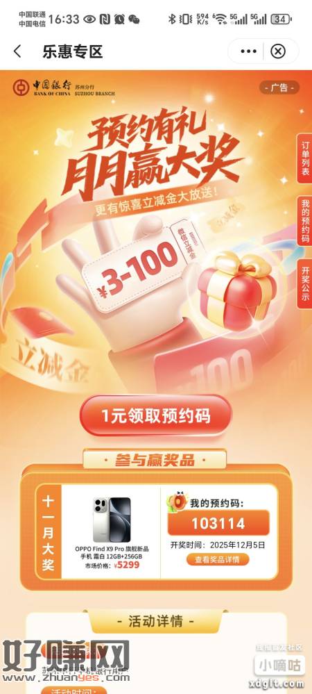苏州地区,中行APP,生活-乐惠苏州滚动横幅预约有礼支付一元得3微信立减金和抽奖机会,当期活动结束无论是否中奖一元原路返回