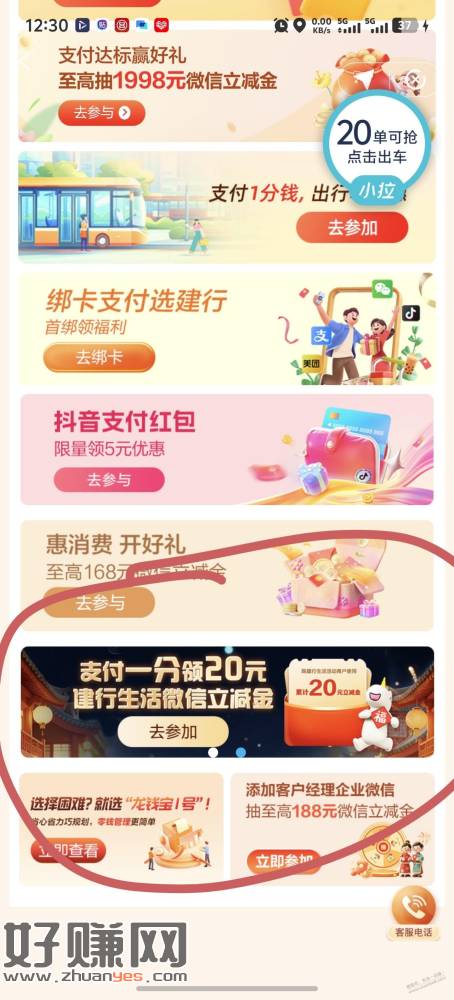 建设银行APP-惠省钱-往下拉,有一个滚动框,支付1分钱领20立减金,10-10一张共2张。可能是天津专属。