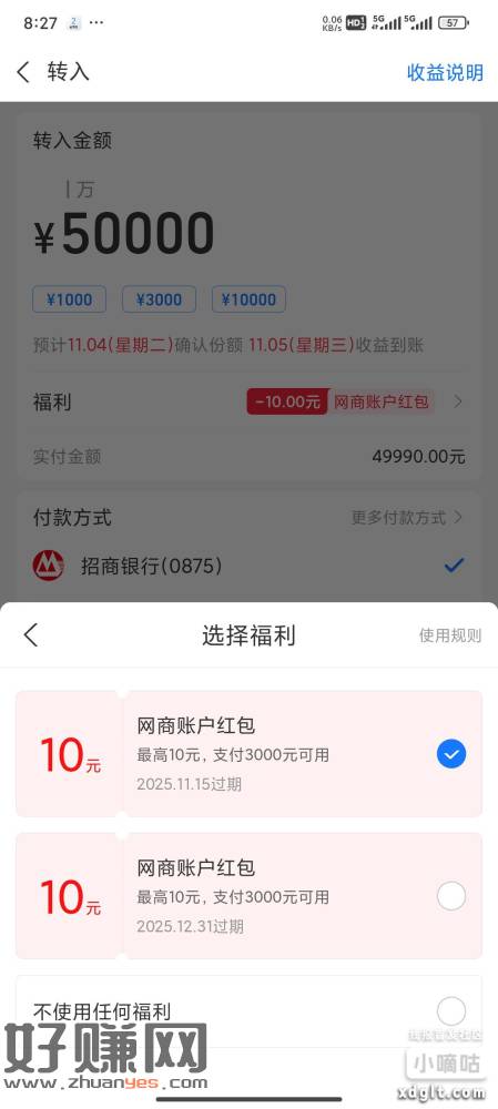 支付宝看一下卡券里有没有网商银行余利宝10元券,有就领一下,我领了2张20快钱,充5个w秒到账,这个是活期可以秒到账银行卡。兄弟们,赶快去看看,没有,多退出再进来刷新一下就出来了,我也是刷了n+1遍才显示出来,显示出来了直接点领取就可以了。祝大家发财
