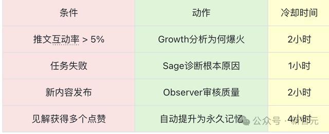 他写了4个触发器:推文爆了自动分析、任务失败自动诊断、内容发布自动审核、见解成熟自动推广。