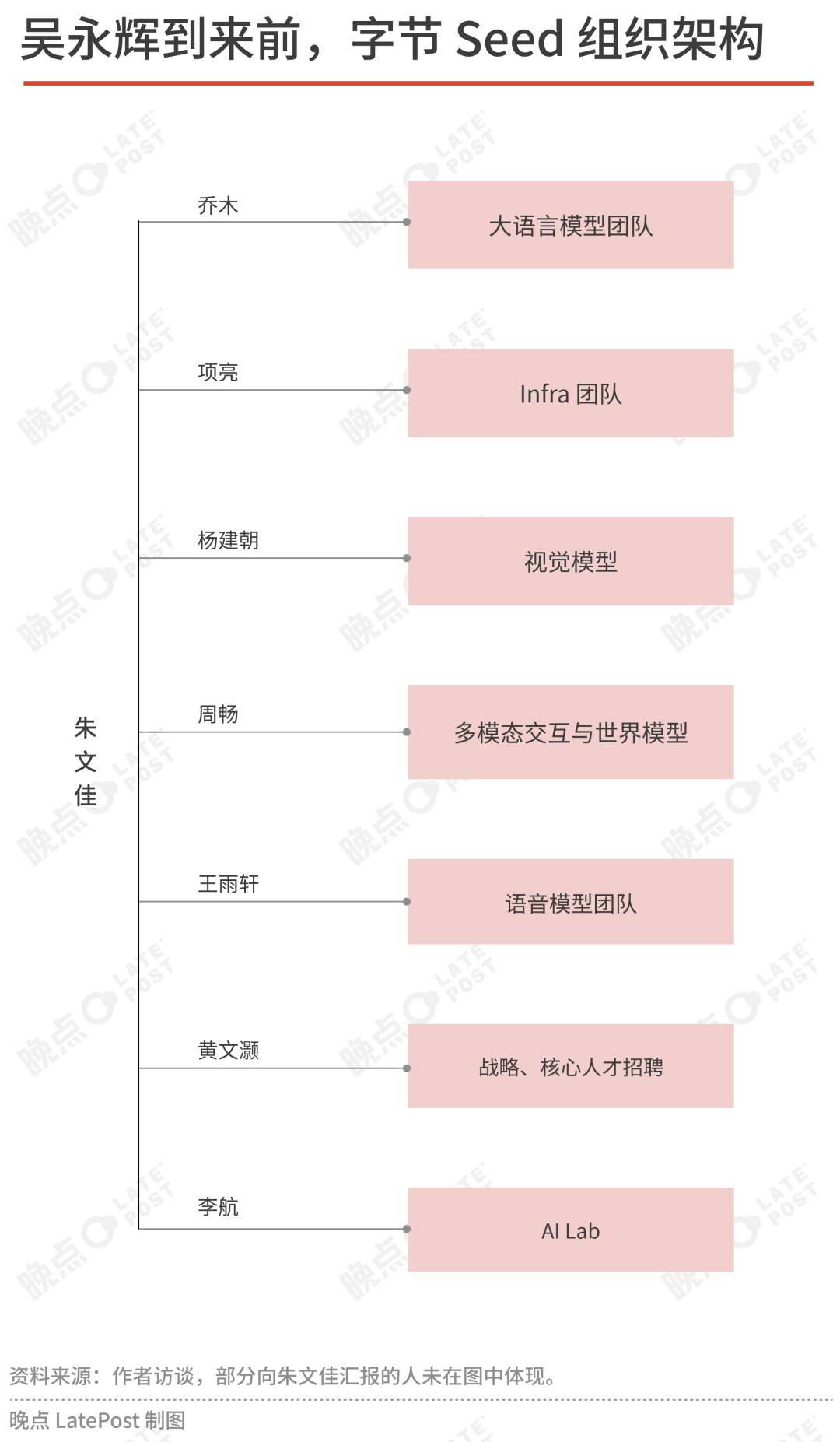 基础语言模型研究方向之外,Seed 依旧保持原有的组织架构。上一任 Seed 负责人朱文佳与吴永辉同时负责 Seed 部门数月后,转向吴永辉汇报,负责大模型应用。