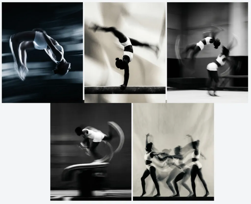 最后一个案例,我用的是一位体操运动员运动时的模糊剪影。我给了它一套 5 张参考图,每张都有很明显的动态拖影,构图也很极简,没有 logo 和文字,但整体质感很强。