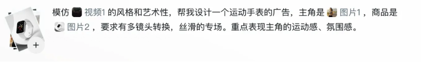 现在在即梦里,你基本不用写很复杂的提示词,按它那个很直观的提示方式来就行。直接告诉它:参考这支视频的镜头节奏和风格,生成一条新的运动手表广告。
