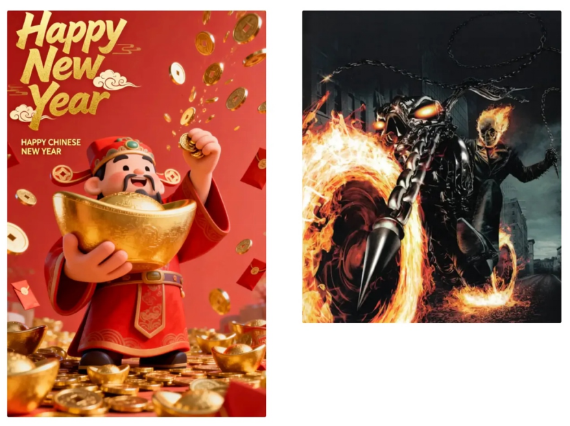 因为它的动效表现确实不错,我就又多做了一组测试。我新生成了一张新春财神抱着金元宝的图,再加上一张美剧风格的恶灵骑士角色图,然后把这两张图一起丢进去当参考素材,让它按这个方向继续生成视频。