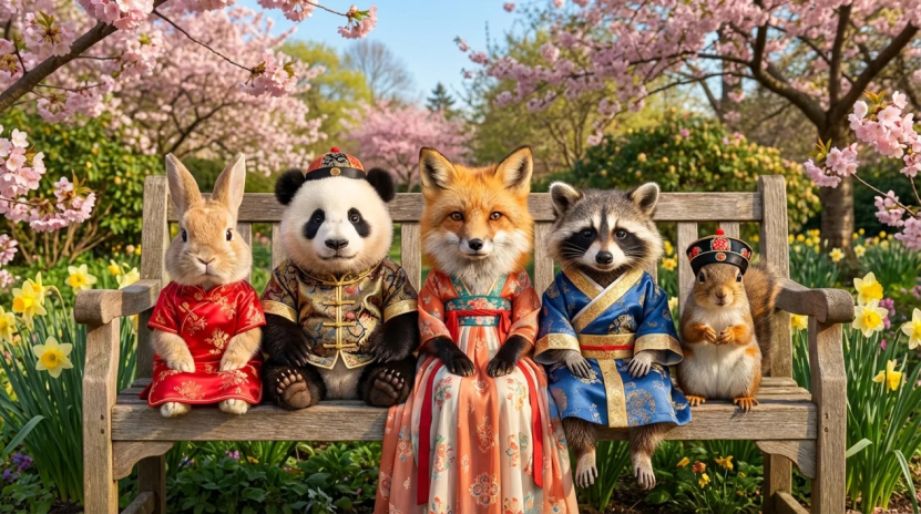 我做了一张图:五个小动物穿着不同礼服,一起坐在同一条长椅上。主体多、造型差异大,还都在同一画面里,这种情况其实挺考验模型的镜头理解和主体保持能力。