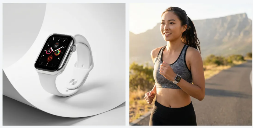 我们一开始,就先做了一组素材:运动品牌风格的人物模特,加上运动手表这种实物产品,一起拿来做测试。